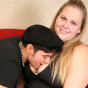 Plump blonde Cynthia sticks out her pink tongue to swallow creamy cum